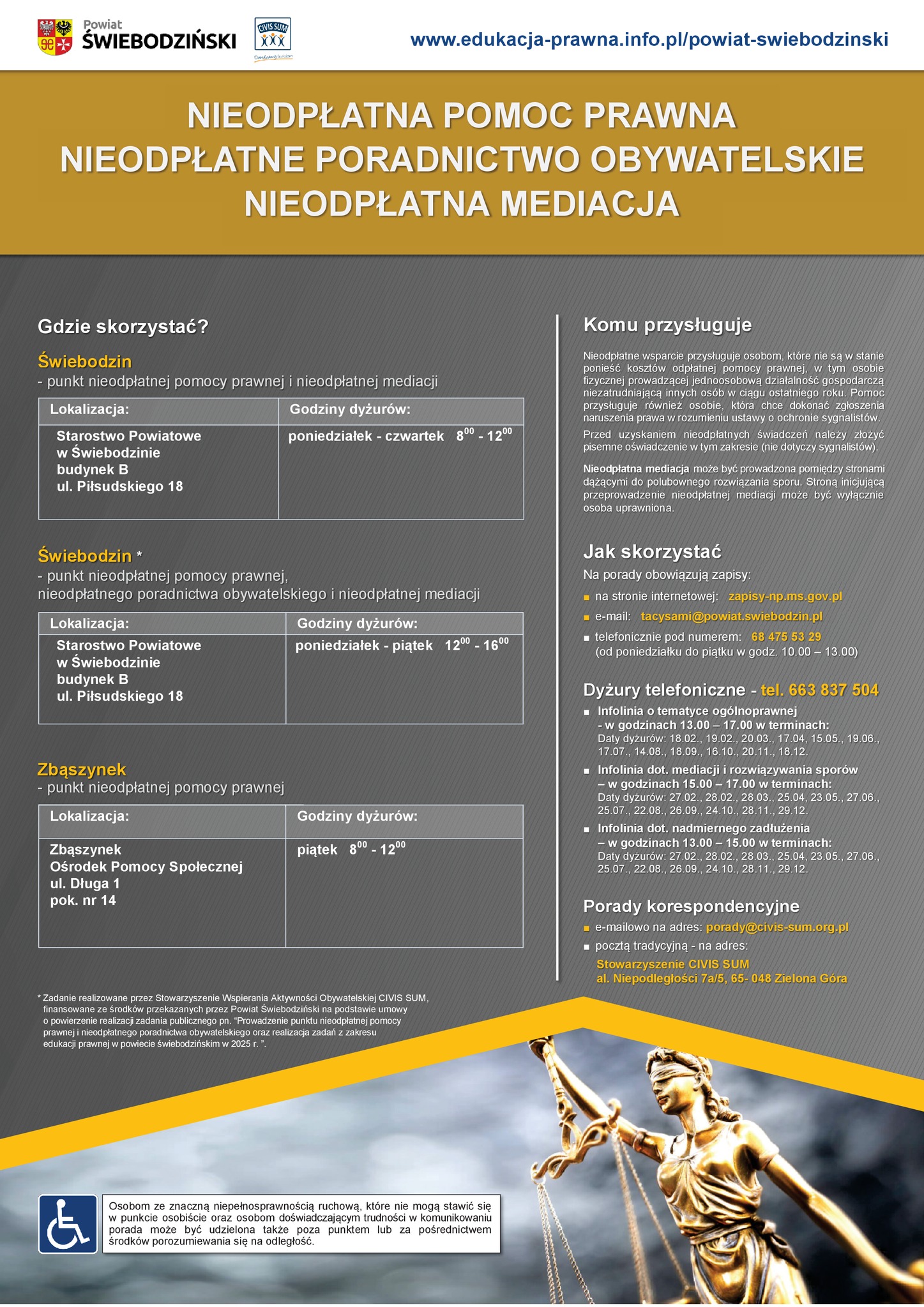 obsługiwany przez Okręgową Radę Adwokacką w Zielonej Górze i Okręgową Izbę Radców Prawnych w Zielonej Górze na podstawie porozumienia z Powiatem Świebodzińskim w sprawie udzielania nieodpłatnej pomocy prawnej