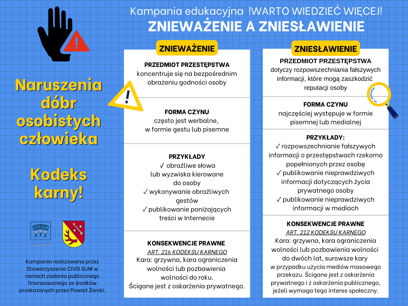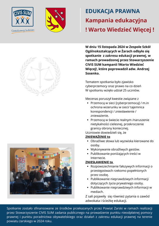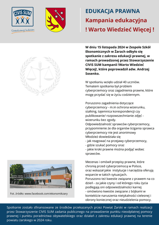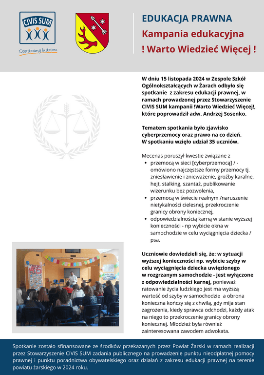 *) Zadanie publiczne pt.: Prowadzenie punktu nieodpłatnej pomocy prawnej i punktu nieodpłatnego poradnictwa obywatelskiego oraz realizacja zadań z zakresu edukacji prawnej na terenie Powiatu Żarskiego w 2025 r. jest finansowane ze środków przekazanych przez Powiat Żarski.