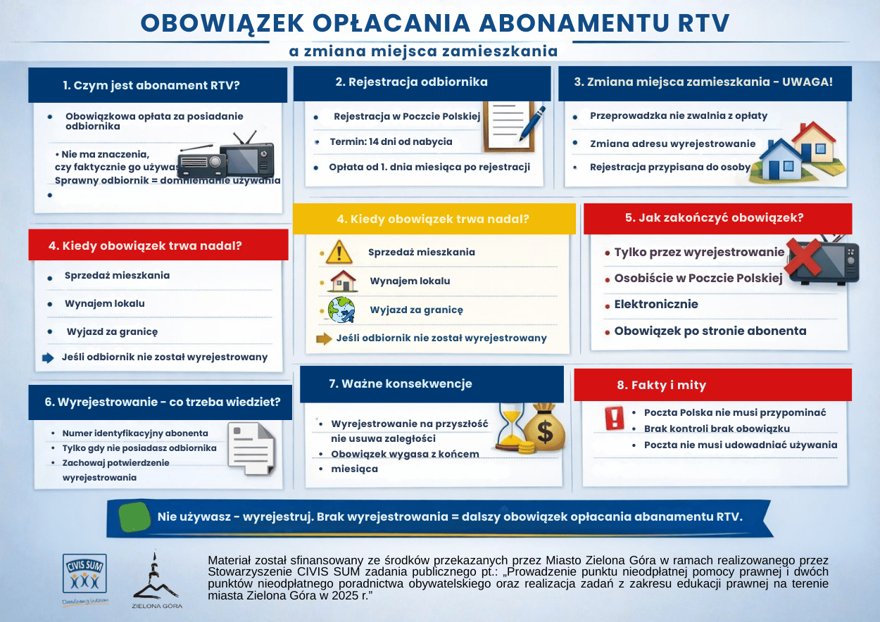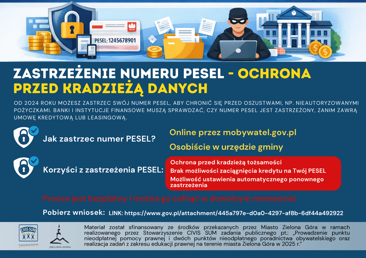 *) Zadanie publiczne pt.: Prowadzenie punktu nieodpłatnej pomocy prawnej i dwóch punktów nieodpłatnego poradnictwa obywatelskiego oraz realizacja zadań z zakresu edukacji prawnej na terenie miasta Zielona Góra w 2025 r. ” jest finansowane ze środków przekazanych przez Miasto Zielona Góra.